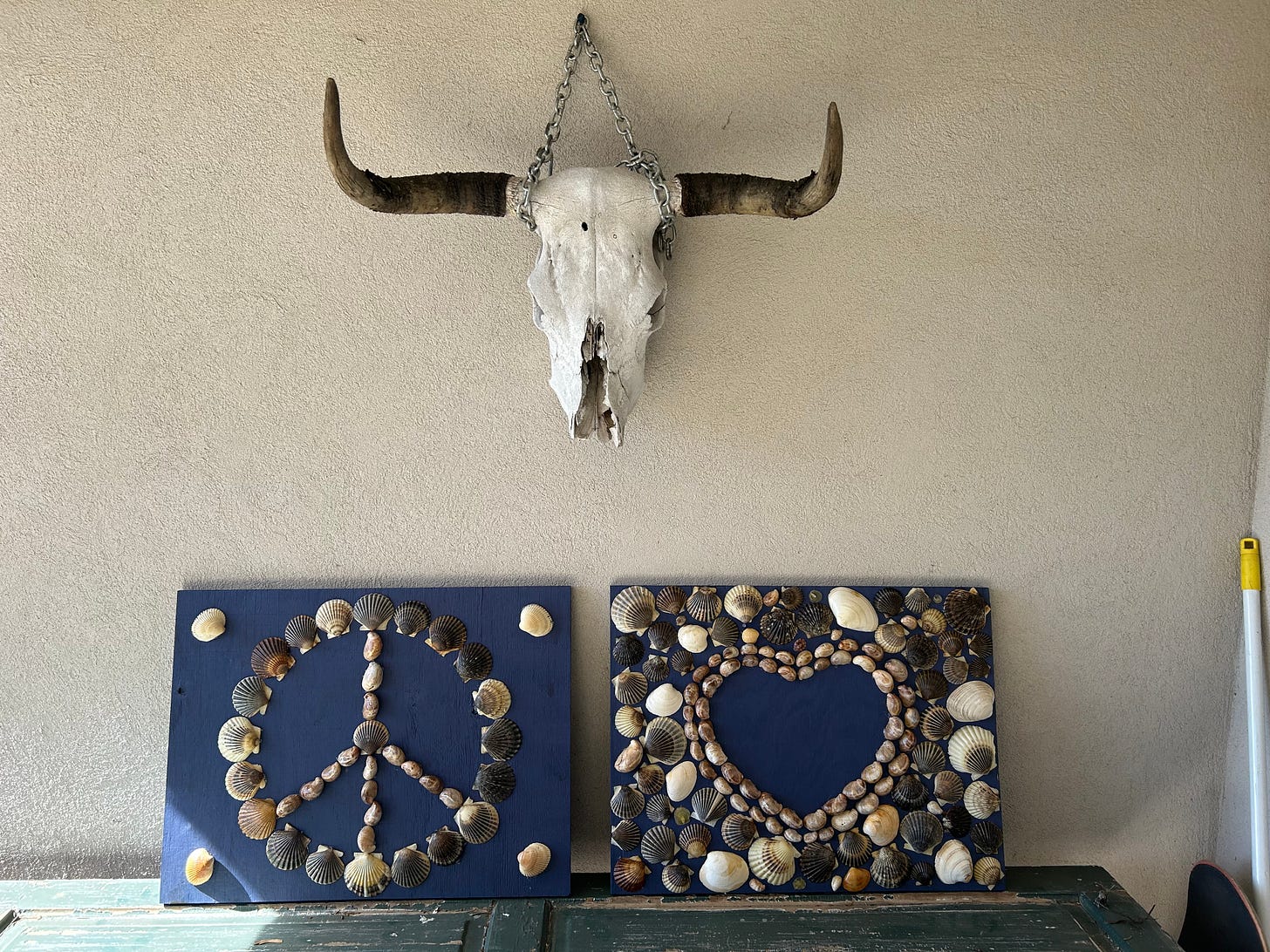 When I get to the end of all your posts, and read the peace and love sign off, I get a very specific image in my minds' eye and it makes me happy. Whenever we make it to a beach, I putter along and collect shells, then stuff 'em in my basement until winter sets in here in Colorado, and then play around with glue and wood and paint and foam, whatever is around. This is last year's work, Peace and Love, attached.